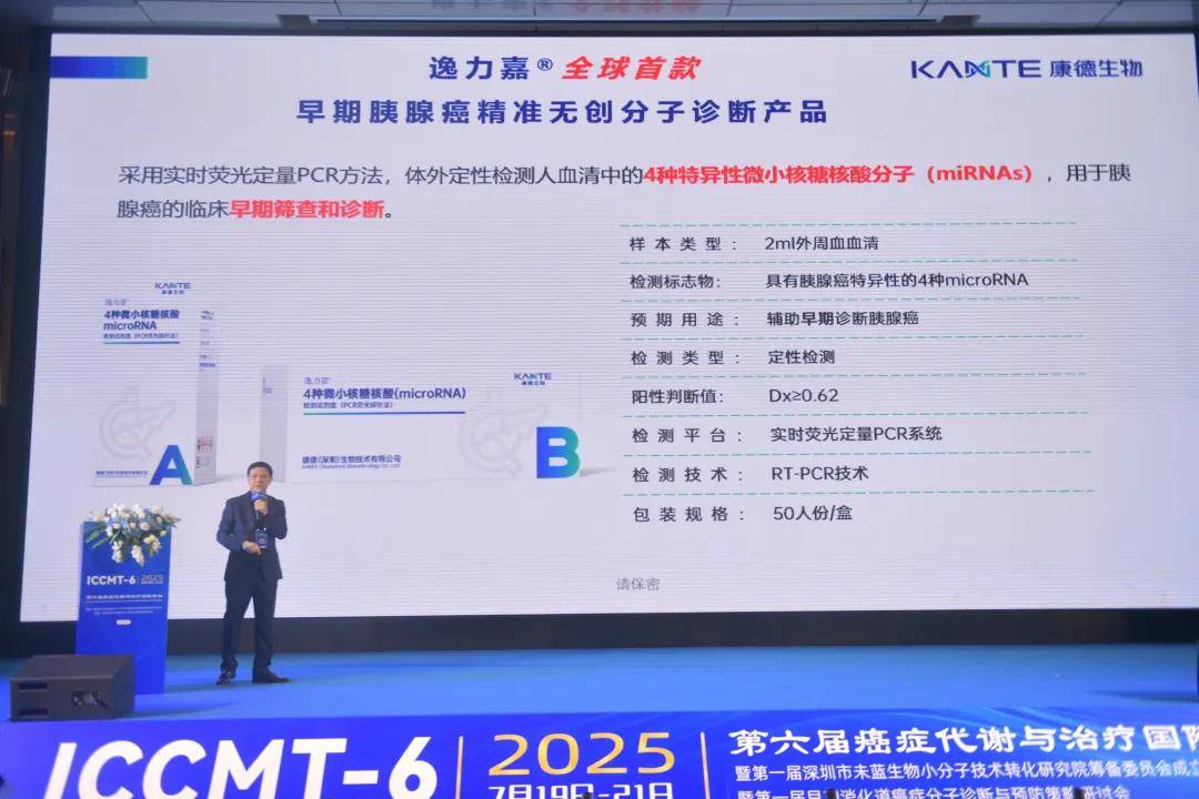 紧接着,康德生物自主研发的逸力嘉®胰腺癌早期检测试剂盒(以下简称“逸力嘉®”)在会上正式隆重发布。这款产品也于近日获得正式获得国家药品监督管理局(NMPA)颁发的三类医疗器械产品注册证(国械注准:20253401406)。肖桂山院士在现场进行介绍。