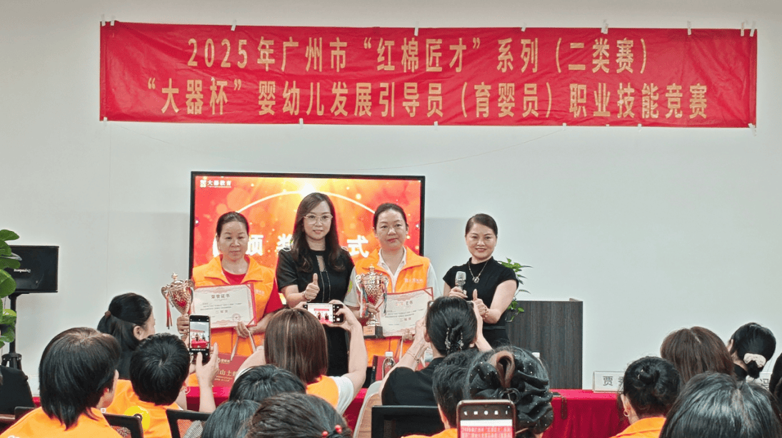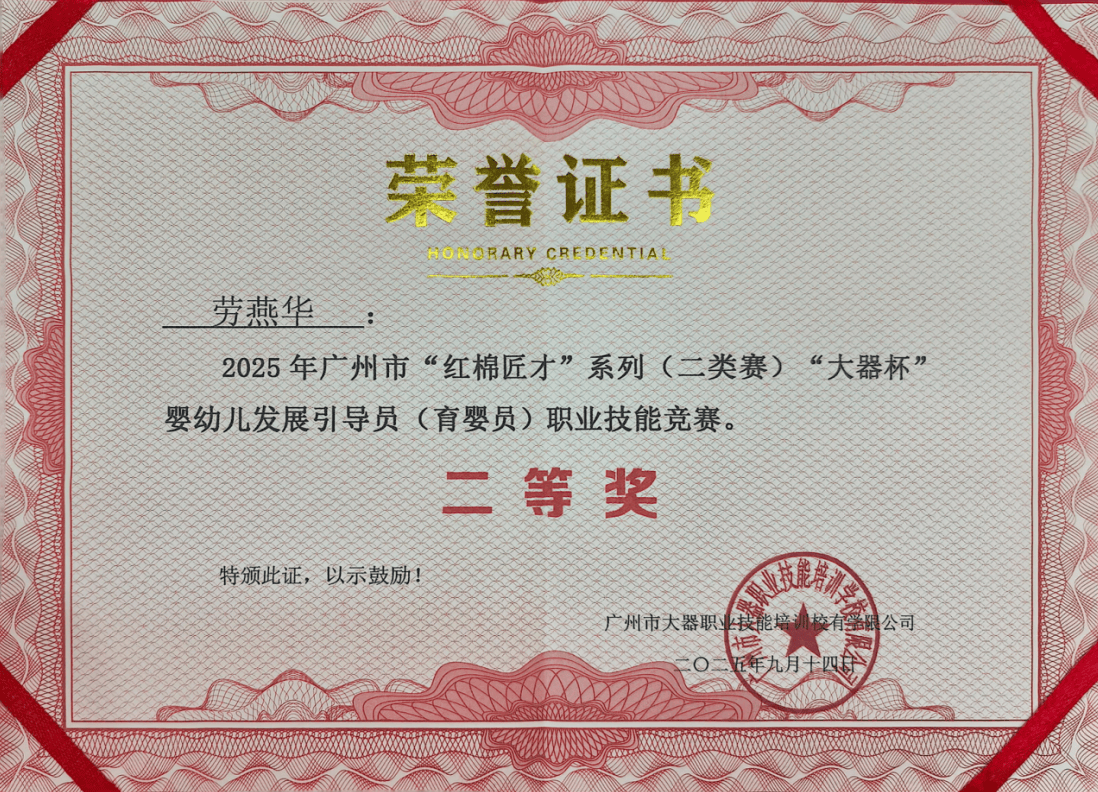 2025年9月14日,由广州市大器职业技能培训学校有限公司主办的“红棉匠才”系列-二类赛-婴幼儿发展引导员(育婴员)职业技能竞赛在广州圆满落幕。本次竞赛是经人力资源和社会保障部批准的国家级二类职业技能赛事,旨在提升育婴员专业素养,推动婴幼儿照护行业高质量发展。广州市白云区粤荣职业培训学校教师劳燕华凭借扎实的专业技能与稳定的临场发挥,荣获全国二等奖,展现了广州育婴技能的卓越水准。