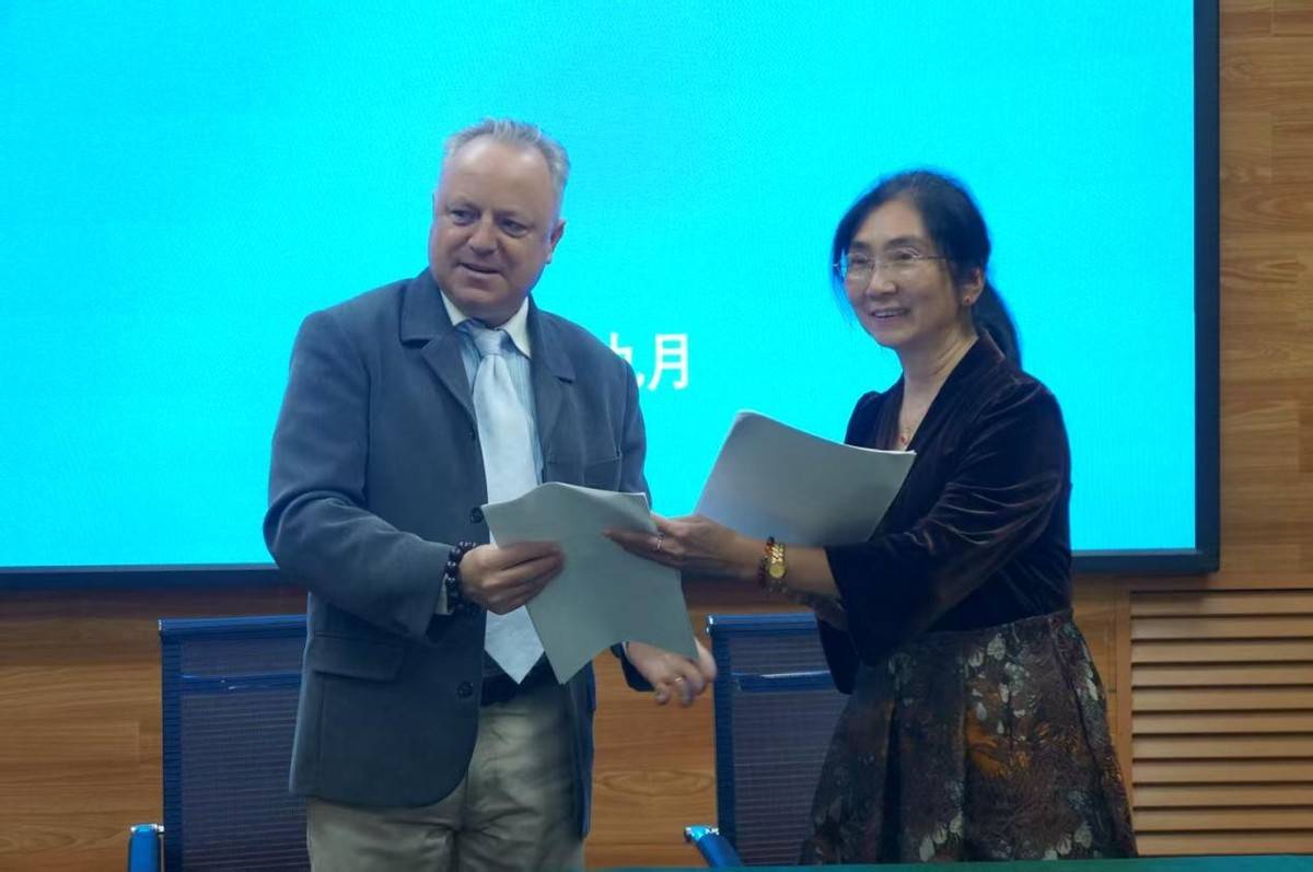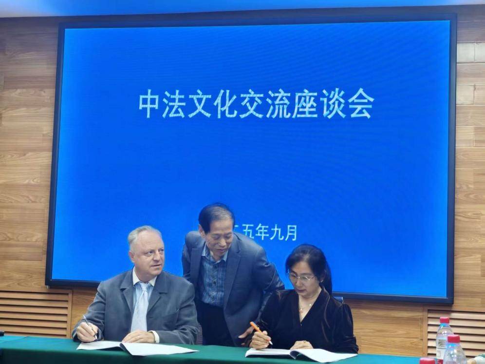 法国文化大使黑哈西先生与西北大学原陕西文化产业研究院副院长张椿鸿女士签定中法文化经贸合作协议。