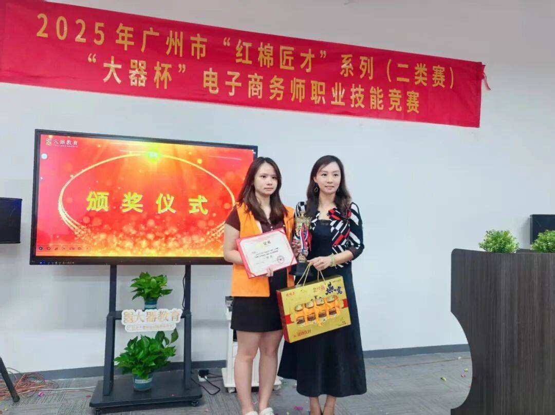 大器学校刘嘉丽校长为获得电子商务师(跨境电子商务师)竞赛一等奖的考生颁奖。