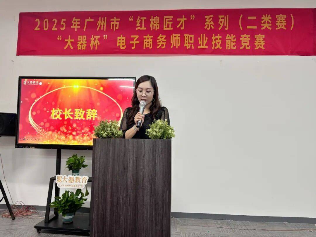 紧接着,大器学校刘嘉丽校长上台致开幕辞:本次大赛将延续“弘扬红棉匠才精神,展技能风采”的竟赛主题,以赛促学,以学促用,为电子商务从业者提供一个交流学习展示自我的平台。本次大赛一共两场,共吸引来自广东省各地140名选手参加,大家相互切磋技艺、展示精湛技能,一技走天下,一技走万家,愿每位参赛者都能赛出水平,超越自我,收获佳绩!并宣布电子商务师(网商)(跨境电商)职业技能竞赛正式开幕!