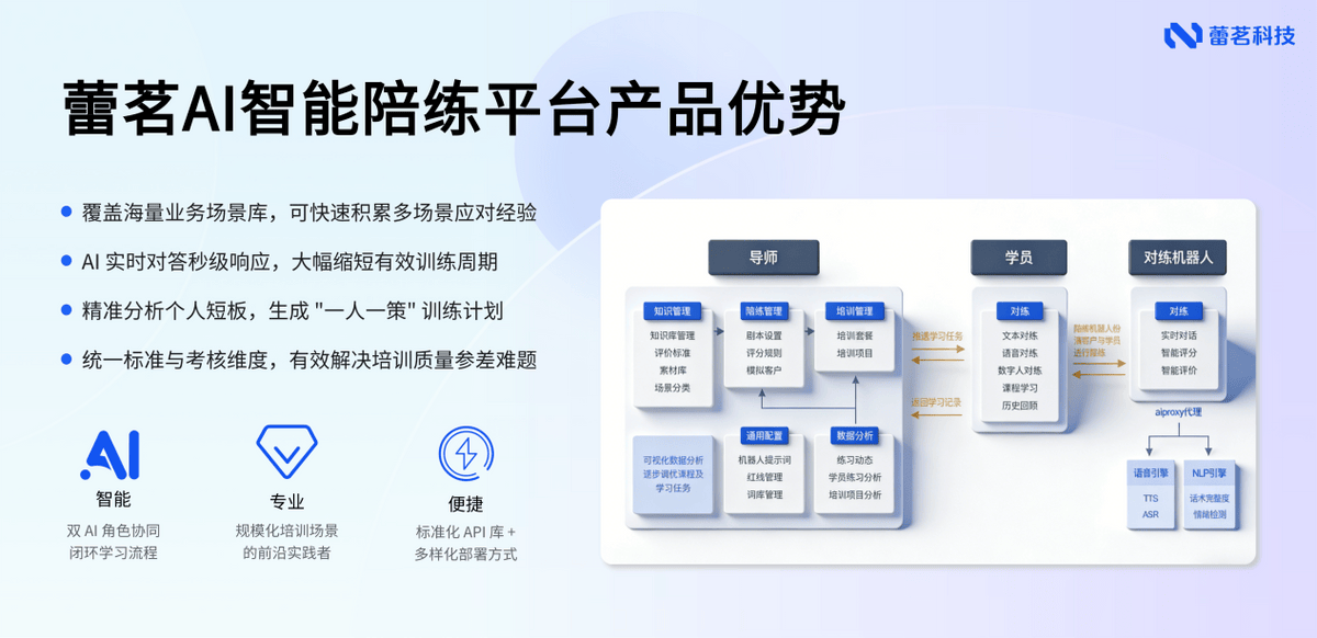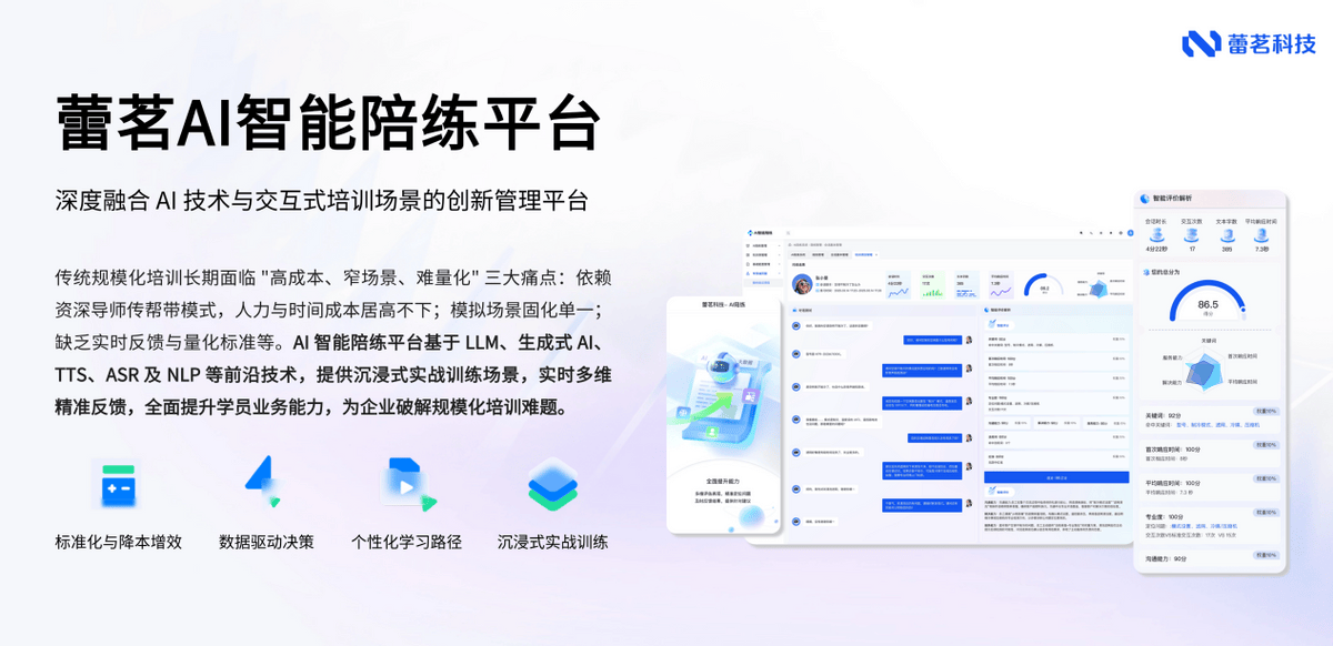 蕾茗AI智能陪练平台聚焦“用AI重构员工培训逻辑”的核心目标,深度融合LLM、生成式AI、TTS、ASR及NLP等前沿技术,构建“教-学-练-考-评”全链路科学闭环。通过技术赋能打破传统培训的场景与效率限制,让培训更高效、更全面、更可衡量,最终破解中大型服务技术岗职场规模化培训难题,实现服务质量的标准化提升。
