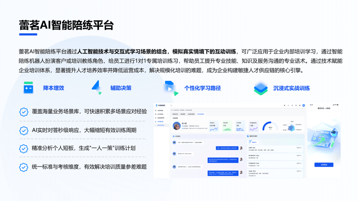 ③依托LLM、生成式AI、TTS、ASR及NLP等前沿技术,平台能生成多样化客户提问与回应场景,还会通过强化学习结合客服反馈持续优化对话策略,让培训更贴近真实服务场景;