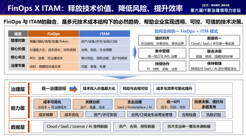 未来,平安期待FinOps从云成本拓展至Cloud+(SaaS、数据中心、License、AI等)全域成本治理,打破单一场景局限。未来,不仅能做到“AI for FinOps”,还能实现“FinOps For AI”。同时在当前多元技术成本结构下,FinOps与ITAM的融合是必然趋势。这一融合能够帮助企业实现透明、可控、可信的技术决策。