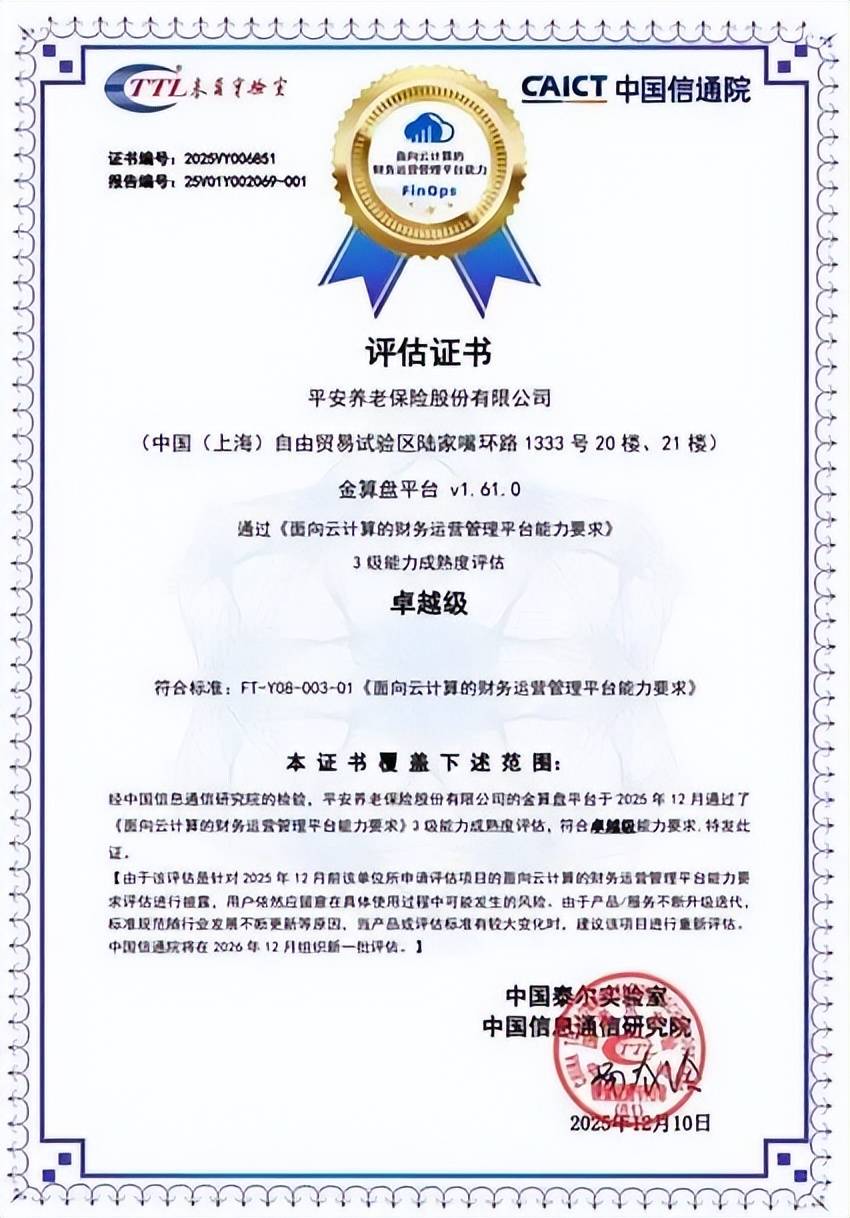 2025年12月16日,平安养老险与平安科技携手获得由信通院颁发的FinOps卓越级评估证书,成为金融行业内首家获得该级别认证的企业。