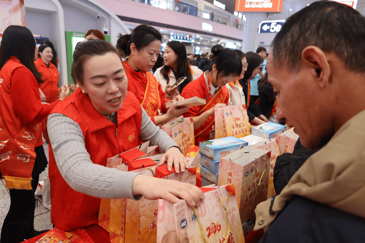 此外,在人流如织的新疆乌鲁木齐站,平安养老险新疆分公司设立“温暖点”,为南来北往的旅客提供急救包、水杯、暖手宝、腰靠等实用物品,并送上春联、吉祥物和节日食品,让归途更温暖,年味更浓厚。
